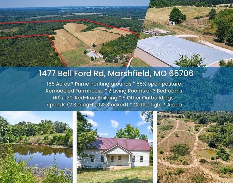 This breathtaking 156-acre farm offers a rare combination of beauty, versatility, and modern updates. Two of the seven ponds are spring-fed and 3 are stocked, perfect for fishing or watering livestock. More than 55% of the land is open pasture—previously used for cattle and currently hayed—with horse facilities already in place. The remainder offers prime hunting grounds, scenic bluff views, and even the potential for a cave exploration. The charming 1906 two-story farmhouse has undergone a near-complete remodel, including crawlspace remediation with moisture barrier, luxury vinyl plank flooring, sheetrock, updated electrical, new windows, roof, appliances, and efficient mini-splits. Enjoy the separate laundry/mud room with propane wall heater off the kitchen—ideal for farm living. A massive 60'x120' red-iron steel building has a separate workshop with concrete floors, 220, and an apartment at the back, with bathroom and loft. The other side has 18' wide doors, on front and side, perfect to store toys and equipment, or add your own horse stalls! Additional improvements include a livestock barn/loafing shed with tack area and enclosed stalls for smaller livestock, ~200'x100' arena with permanent corral, grain silo, 4-bay carport, well house with storage, and an outhouse! Whether you're seeking a working farm, recreational retreat, or a combination of both, this property delivers the best of the Ozarks—peaceful countryside, modern updates, and endless possibilities.