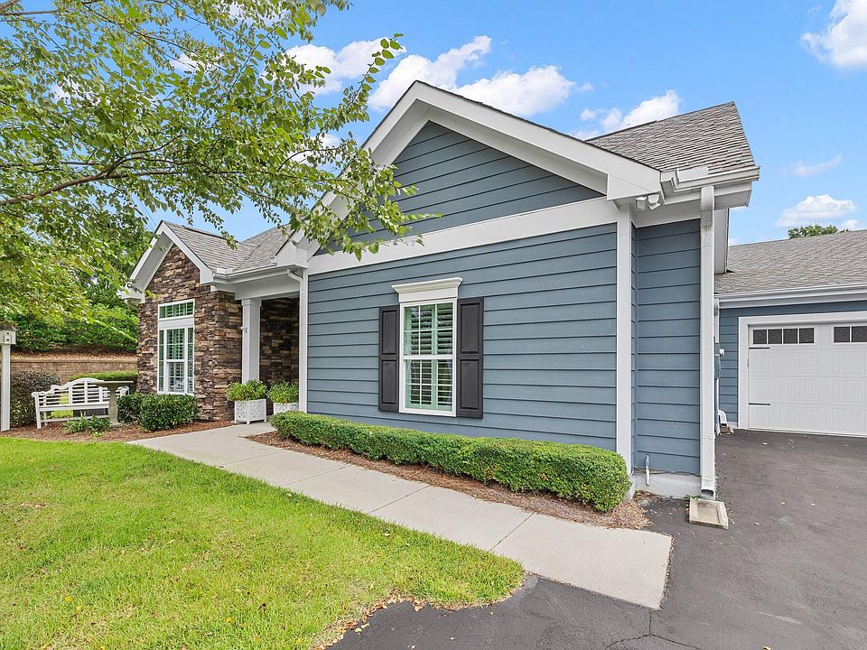 Privately set back off the street, this single-level 2BD/2BA home with an office/sunroom in Apex combines comfort and thoughtful upgrades in an active adult community designed for easy living. The open floor plan with cathedral ceilings feels bright and welcoming, and the granite island kitchen features upgraded stainless appliances, a tile backsplash, and a convenient pantry with glide-out shelving. Sunlight pours into the living space, where custom fireplace built-ins create a warm centerpiece, and upgraded plantation blinds cover the transom windows for added privacy. The primary suite offers soaring ceilings, a walk-in closet, and a tiled, easy-entry shower. The laundry room includes a sink, custom cabinets, and an oversized storage closet with shelving, while the extended 2-car garage provides three additional custom-built storage closets with shelving—added by the builder for extra convenience. Pull down attic access from the garage. Outside, the fenced patio is perfect for gardening or quiet relaxation. Residents enjoy community perks such as exterior maintenance, a clubhouse with a fitness room and social events, and a pool—all just minutes from downtown Apex, shopping, dining, healthcare, and Duke Primary Care right down the street.