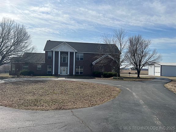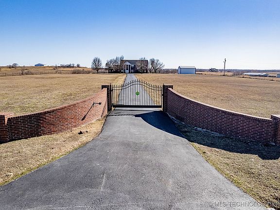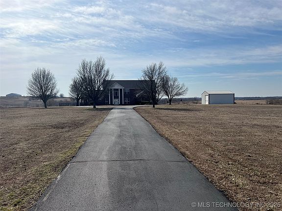 This Jeffersonian Neo-Classical home sits on almost 5 acres with a 360 degree view. After you enter the iron gate, the asphalt driveway arrives at the front porch graced by four white columns. The front door opens onto a large foyer with a beautiful staircase and a powder room. The first floor has a large dining room, a very efficient kitchen, an over sized laundry and a cement safe room. The kitchen has an electric range, an oven, microwave, and refrigerator. There is an island, bar, and breakfast nook with beautiful views. The living room has a fireplace and the views from this room of the adjacent ranch are spectacular. The master bedroom has wonderful views from the over sized windows. The master is a large bedroom with a sitting room with a gas log fireplace. The bath suite presents double sinks, a shower, soaking tub, drawers and cabinets. The large walk-in master closet includes built-in drawers. The second floor has a his and hers office with cabinets and a large walk-in storage closet. Two bedrooms with built in drawers are also on the second floor. These two bedrooms share a Jack and Jill bathroom and each bedroom has a large closet. At the end of the hall is a large den/playroomwith a wet bar and ice maker. Off of this den/playroom is a wooden deck that allows a 180 degree view of the farmland to the south. A 14 X 40 storage room also on the second floor. This room also holds two large hot water heaters. The outside shop building is 30 X 40 and has lots of electric receipts, with a large garage door that can accommodate a helicopter or RV . The owners have taken excellent care of this beautiful and comfortable home. The seller will replace the deck before closing or will give an allouance of $5,000 and let you replace it the way you want it done.