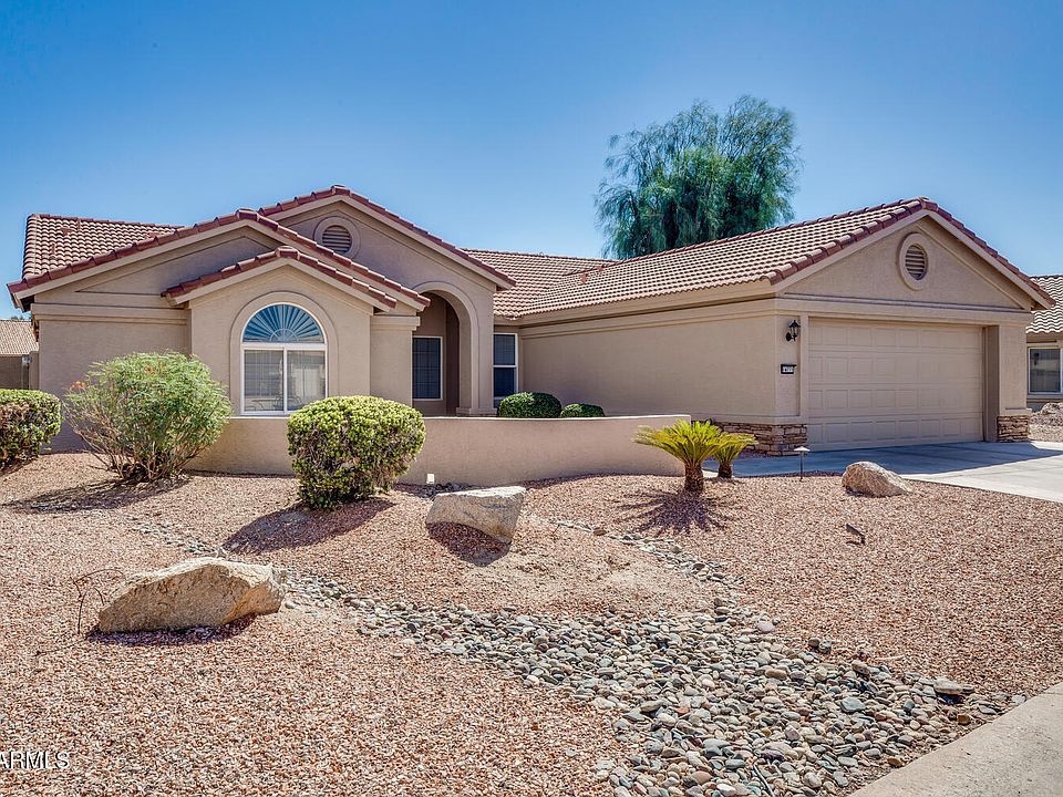 Enjoy luxurious resort-style living in PebbleCreek's active retirement community either year-round or as a second home in the sun. Ideal location close to shopping, dining, and only 25 miles to Sky Harbor Phoenix Airport, this highly sought-after location welcomes you with stately palms at the guarded gate entrance. Welcome friends upon arrival at the front courtyard of the newly painted exterior, and enter into the soaring great room perfect for a seating area, library, and formal dining entertainment. Show off brand-new stainless steel appliances in the kitchen and newly remodeled bathrooms, or immerse yourself with surround sound while watching a movie in the family room. Have a hobby that requires a workshop? Create to your heart's desire in the temperature-controlled hobby room, just inside the garage, with a newer HVAC in 2024. With OWNED solar, your energy costs are significantly reduced! Out back, relax in the shade under the extended patio and listen to the soothing sounds of the water feature. Turn this backyard into a grill master's dream with plenty of space to design your outdoor kitchen or add a pool for private swimming. On a pie-shaped, large lot, there's plenty of room to make the space fit your outdoor needs. The side gate is designed to drive a golf cart through and park behind for easy access. Ride the golf cart to the Clubhouse amenities of golf, pickleball, tennis, swimming, and so much more! Or walk to the neighborhood park, adjacent to the home, with room for the dog to enjoy the grassy lawn, or for you to play horseshoes or bocce ball with friends. With a club for every interest, you'll easily meet your new friends in PebbleCreek.