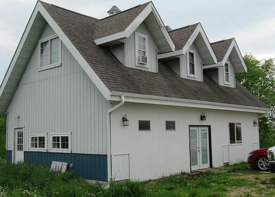 - Wood Siding, Cement Board, Gray Siding, Blue Siding