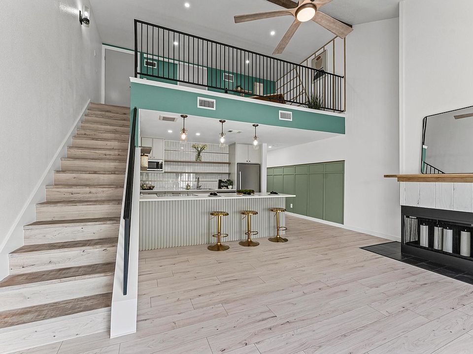 Cozy fireplace mantelModern pendant lightingFlush ceiling lightsBrand-new laminate flooringPrivate covered back patioRaised ceilingsUpgraded electrical outlets