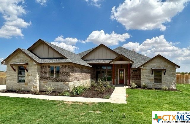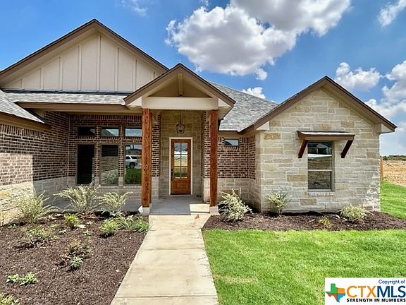 A stunning rock and brick home located in Flint Ridge Estates! This 4 bedroom 2 1/2 bath features wood look tile in all main living areas, tile in the wet areas, and carpet in the bedrooms. Quartz counter tops, high ceilings, crown molding, and coffered ceilings offer the finishing touches you will appreciate. The primary bathroom offers an incredible double walk in shower with dual shower heads and a soaking tub. Just what you need after a long day! Situated on just over 1/2 acre in Salado I.S.D. Huge Builder Incentives available! $20,000 paid towards buyer closing costs/rate buy down and an additional 1% of loan price paid towards rate buy down with preferred lender.