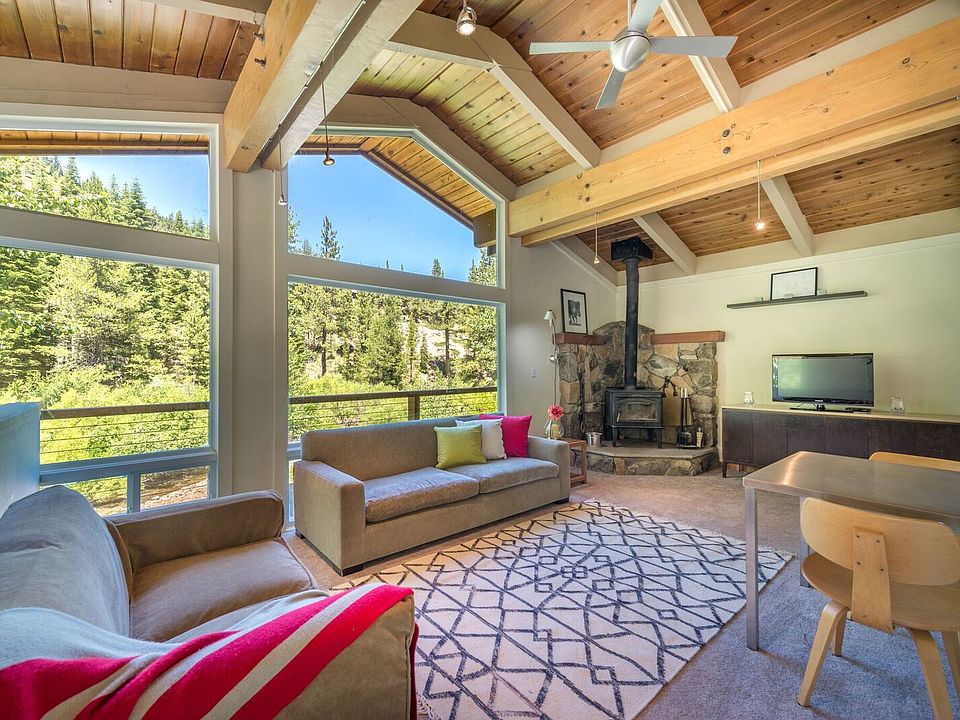 Serene settings and mountain peaks at Alpine Meadows. Centrally located 3 bed, 2 bath mountain cabin is the perfect home base to enjoy the beauty of what Lake Tahoe has to offer. You will feel right at home in the sun-drenched, floor to ceiling windows in the great room bringing a visual transparency of the outside overlooking Bear Creek. Easy, simple living, the home is both intimate yet comfortable at 1,344 sf. Entertain on the wraparound deck. Large driveway and plenty of storage space downstairs.