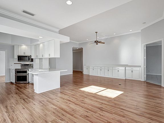 The spacious great room features custom wood and quartz built-ins and flows seamlessly into the expanded screened patio and lanai, offering the ideal space for outdoor entertaining while enjoying tranquil views of the lake. Inside, the sleek quartz countertops in the kitchen and baths, open floor plan with high ceilings along with elegant laminate and tile flooring add a touch of sophistication.
