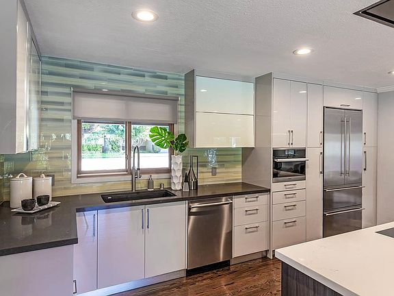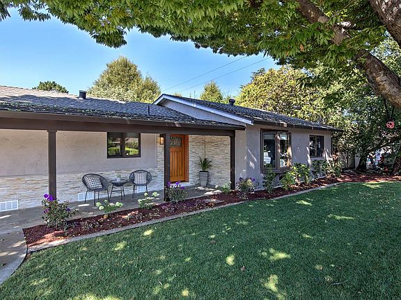 Contemporary remodel with sleek style in sought-after South Los Altos. Large corner lot with newly landscaped gardens and mature shade tree. Tremendous great room for formal and everyday living with wall-mounted wiring and two sets of sliding doors to the rear patio and pool. Modern kitchen with high-gloss perimeter cabinetry, large island with breakfast/wine bar seating, walk-in pantry, quartz countertops, glass-tile backsplashes and top-of-the-line stainless steel appliances. Master bedroom suite with organized walk-in closet, en suite bath finished in porcelain tile with cedar-lined spa. Additional bedroom suite plus two bedrooms served by a hallway bath. Swimming pool surrounded by a vast patio and lawn in a very private setting. Attached 2-car garage. Excellent Los Altos schools!