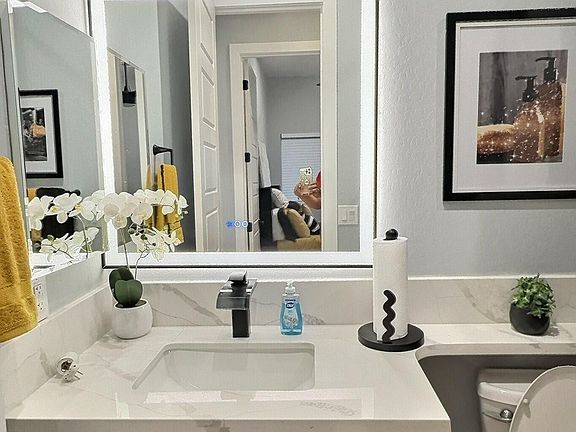 The guest bathroom is a showstopper with a Jacuzzi tub and spa-inspired finishes.