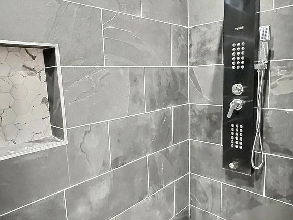 The master suite is a true retreat with its private entry, resort-style bathroom featuring floor-to-ceiling slate tile, and a custom walk-in closet. Bedrooms 2 and 3 also offer custom closets for organized living.