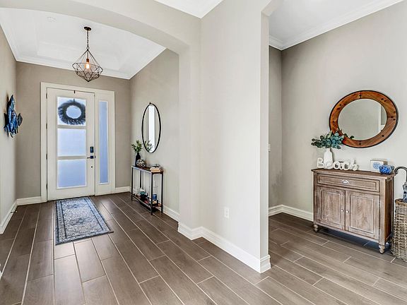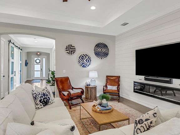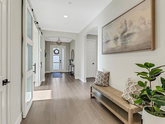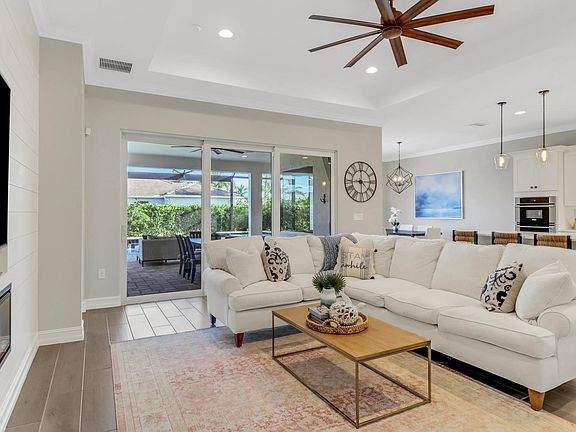 This home features a large open concept great room with a custom accent wall and linear fireplace. The upgraded kitchen includes custom cabinets and an oversized island. There is a generous primary master suite and ensuite, den/office, and 2 additional bedrooms each with their own full bathroom. The screened-in outdoor oasis includes a well-appointed summer kitchen, large pool & spa, and outdoor bathroom. This home has a 3-car garage and endless upgrades including an integrated Sonos sound system with indoor/outdoor ceiling speakers, bespoke built-in closets, AC in garage, upscale furnishings, and Smart TV's in living room/guest bedrooms.
