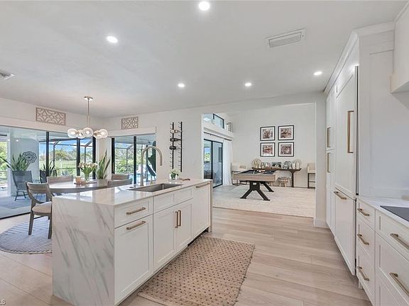 Stunning 4-Bedroom Pool Home with $150K in Dream Upgrades & Sunset Views in Eagle Ridge This home has been fully transformed with over $150,000 in dream upgrades, combining sleek designer finishes with modern functionality and peace-of-mind features you won’t find anywhere else. The southwest-facing backyard is a true showstopper, offering expansive views of the 17th fairway and two lakes, with breathtaking sunsets every evening. Just today, a bald eagle was seen grazing on the fairway before soaring into the sky—a fitting sight for Eagle Ridge Golf Community. The eagle, a timeless symbol of freedom and strength, reflects the rare balance of nature and luxury living found here. Outdoor space, your way: Remove the lanai cage for an open-air, resort-style vibe and unobstructed views Add a fence for a secure dog yard or play space Keep it as-is for classic Florida living Inside, you’ll find 4 bedrooms, 2.5 baths, and over 2,500 sq. ft. of living space, plus a 2-car extended garage and a 1,355 sq. ft. pool surround with a spacious, covered lanai. The designer-renovated kitchen is the crown jewel, featuring: Custom, soft-close shaker cabinetry with sleek brass hardware Dramatic, full-height quartz backsplash Top-of-the-line built-in appliances, including a paneled extra-deep refrigerator, double ovens, and smooth cooktop Thoughtful drawer storage and under-cabinet lighting This stunning kitchen perfectly blends style and function, making it the heart of the home for cooking and entertaining. Throughout the home, high-end LVP flooring provides a clean, modern look. Additional major upgrades include: Whole-home water filtration system New sprinkler system Kitchen and bath re-piping Pocket sliders that open wide to the pool area for a seamless indoor-outdoor flow The split-bedroom floor plan ensures privacy for guests, while the spacious owner’s suite and cozy family room—featuring an electric fireplace with an option to revert to wood-burning—make this home both welcoming and practical. Why This Home Stands Out Ultra-low HOA fees – only $300/year Pay-as-you-play golf – no membership required No flood zone and never flooded – hurricane-friendly, stress-free living Hospital power grid location – rarely loses power Generator hookup in garage for added peace of mind Minutes to RSW Airport, shopping, dining, and sports stadiums