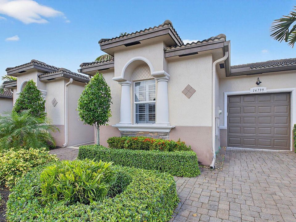 Move-in ready 2 bedroom/2 bath and den and 1 car garage ''Sortino'' villa.Den has closets so can be used as 3rd bedroom. This upgraded beauty shows like new. Wood kitchen cabinetry, granite counters and backsplash, new French 4-door refrigerator, new dishwasher, neutral tile flooring throughout, crown molding, plantation shutters, designer fans and fixtures, frameless showers, new smoke detectors, closet built-ins, garage shelving, upgraded gutters,extended lanai with beautiful water views to enjoy your S. Florida lifestyle.Villaggio Reserve is an active 55+ community with a 38,000 s1 ft clubhouse, resort style pool, lap pool, kiddie pool, jacuzzi, cafe, exercise room, clubs, 6 pickleball courts, 5 tennis courts and 2 bocce ball courts.Come and live your best life!