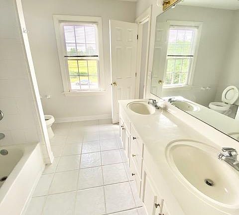 Shared full bath up stairs has 2 sink vanity and lots of cabinet/ closet storage.