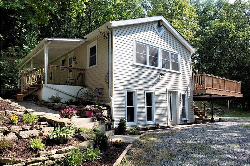 Enjoy the scenery and privacy of this adorable move-in ready ranch home with MANY updates on 2+ acres in Quaker Valley school district. Exterior updates include all new siding and many new new windows, concrete work and extensive landscaping. "New" retro-modern cabinets and butcher block countertops in the kitchen as well as an updated rustic-style bathroom with beautiful slate tile and shiplap walls. Fresh paint and new carpets in the bedrooms, with hardwood in the master. Full-light French doors lead out to the large newly refinished deck - a great outdoor entertaining space! Ample parking in the huge driveway with space below deck providing covered parking or extra outdoor storage.