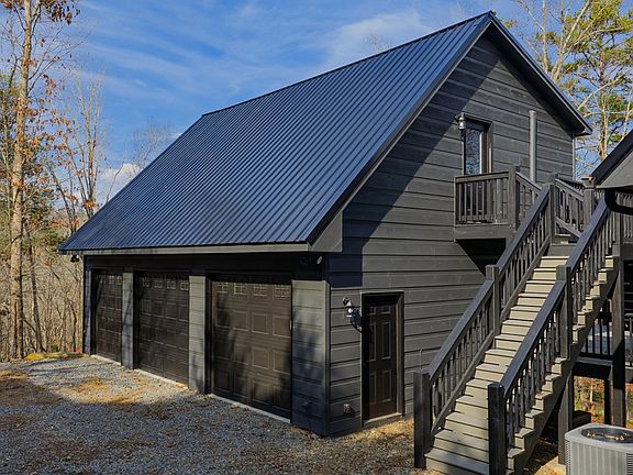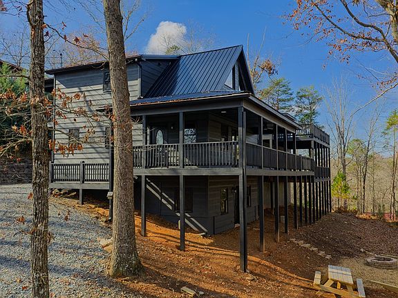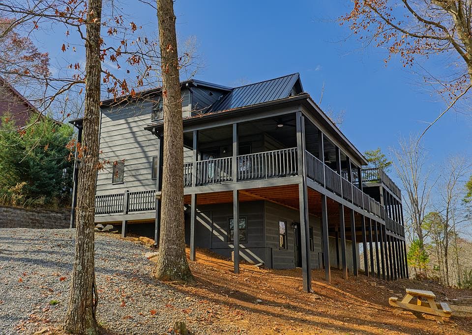 This recently 4-bedroom, 4-bathroom mountain cabin features amazing multi-level decks and breathtaking seasonal views. It includes a private garage apartment and ample parking, including a hard-to-find three-car garage. This is not your typical cabin. This Cabin is conveniently located just minutes from the fishing pond, and river access, tubing/kayaking, dog park, hiking, indoor pool, mini golf, tennis, pickleball, and more. Join in with the many activities going on throughout the year with zumba, dance classes, yoga, card clubs, Bingo, live music during concert season; the list goes on and on. Downtown Ellijay is only minutes away for dining and shopping, and the town is surrounded by multiple wineries, apple houses. and biking trails.