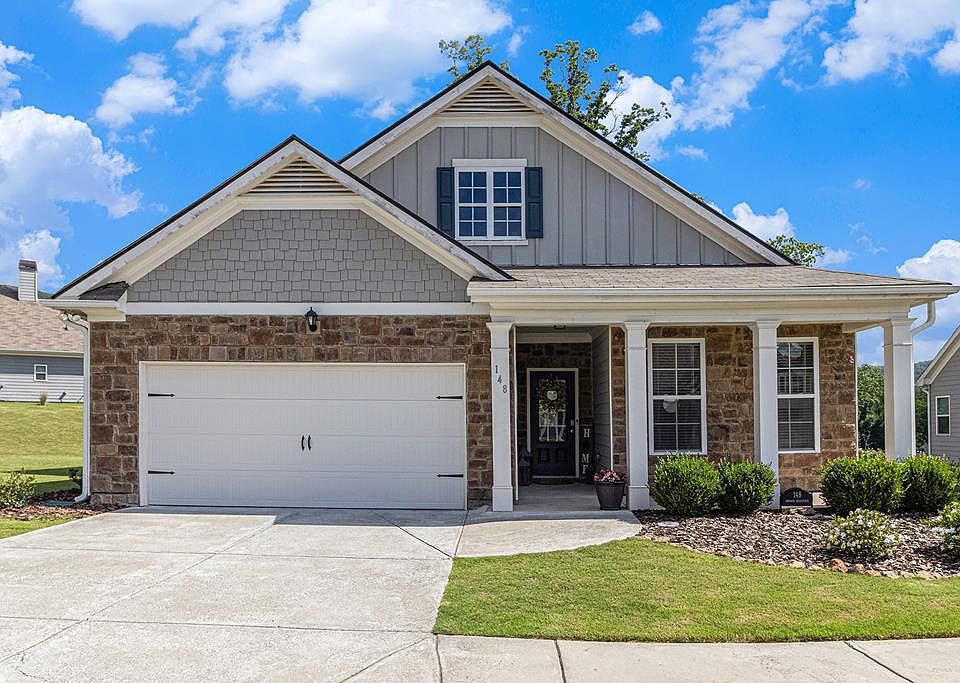 This beautifully upgraded 4-bedroom, 3-bathroom ranch-style home features a versatile split floor plan and was previously a model home, showcasing numerous high-end upgrades. The spacious kitchen overlooks the living room and includes stainless steel appliances, double ovens, granite countertops, a generous island, and a large pantry — perfect for everyday living and entertaining. The main-level primary suite offers a private retreat with double vanities and a standalone shower. Two additional bedrooms and a full bath complete the main level. Upstairs, you'll find a fourth bedroom, a full bath, a storage closet, and a large bonus room — ideal for a second living area, playroom, or home office. Step outside to a secluded, tree-lined backyard and unwind on the covered patio — perfect for enjoying the outdoors year-round. Located in the highly sought-after gated community of Lake Arrowhead, residents enjoy a 540-acre lake — one of the cleanest in Georgia — surrounded by the scenic North Georgia mountains. Community amenities include a clubhouse with a restaurant, championship golf course, tennis and pickleball courts, a yacht club, multiple pools, hiking trails, parks, a dog park, and more.