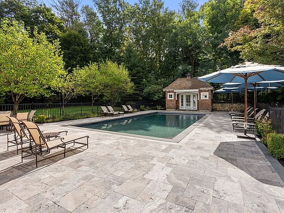 Extraordinary shingle style home designed by prominent architect on over 2 acres of incredible land. Over 11,400 sq ft of living space on 4 floors. Features include remarkable theater w/ gold leaf & 9 ft screen, billiard room w/ oversized bar & fireplace, gym, phantom 6 car garage! Most amazing outdoor space! Incredible inground pool with pool house including kitchenette and bath, outdoor kitchen plus fire pit with speakers and tv. Wine room featured in design magazines. This home has the ideal floor plan with the kitchen family room as the central focus- kitchen with large center island and radiant floors opens to casual dining and family room w/ fireplace & custom book shelves and window seat. Formal dining room with hand painted wallpaper. Oversized living room w/fireplace leads to custom built library. 2nd floor homework/craft room. Exquisite details & custom woodwork throughout. Heated driveway. Direct access to hiking trails to Highland Forest. One of a kind and not to be missed.