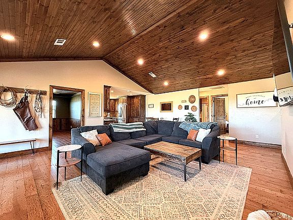 The 2,200 square foot layout features solid wood floors, abundant natural light, and an open living area highlighted by soaring vaulted ceilings. Large windows frame wide-open views of the surrounding land, creating a bright, comfortable feel throughout the home.