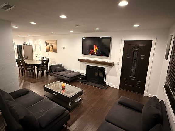 Spacious living and dining area with fireplace and mounted smart TV