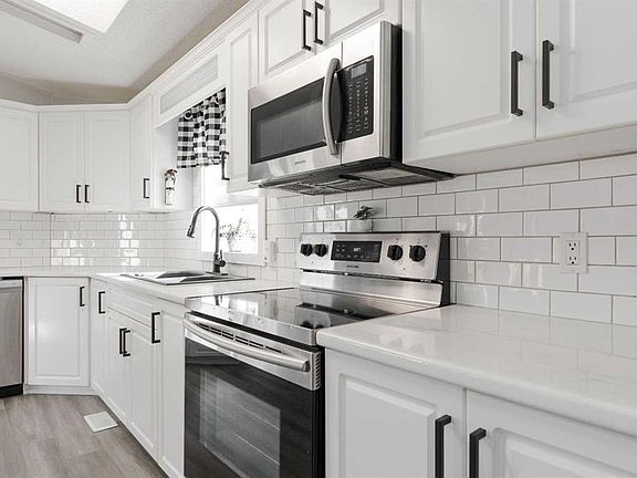 Modern kitchenWhite subway tileSleek epoxy countersStainless steel appliancesWarm gas fireplaceSpacious new deckGated rv parking