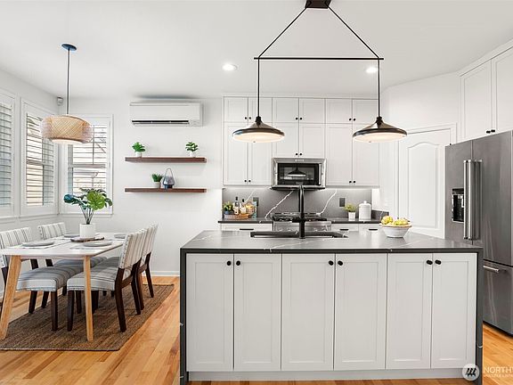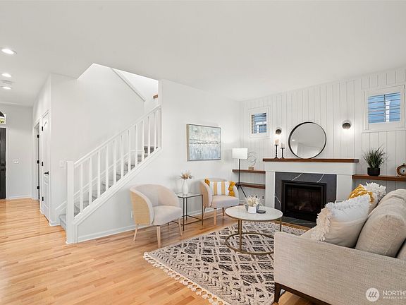 Beautifully remodeled and featured in West Sound Magazine, this Poulsbo Place craftsman blends timeless charm with elevated, modern updates. The 3-bedroom, 1.75-bath layout offers a free-flowing kitchen, dining, and living area with rich hardwood floors, high ceilings, and a welcoming fireplace. The kitchen shines with upscale finishes and sleek new appliances. Upstairs, you'll find two additional bedrooms and a stylishly renovated bathroom. Step outside to a private patio overlooking the courtyard—perfect for morning coffee or evening unwinding. An extra-long detached garage provides ample storage. Just blocks from the shops, restaurants, and waterfront parks of downtown Poulsbo.