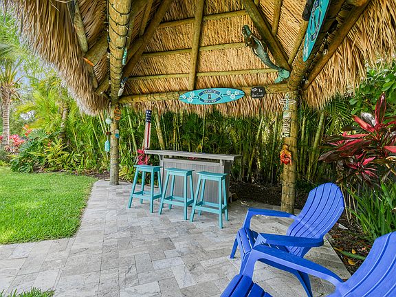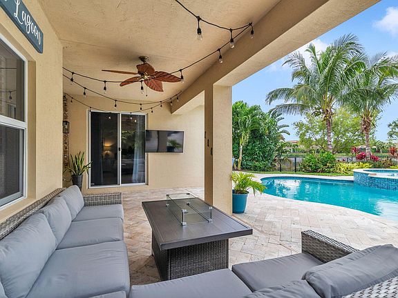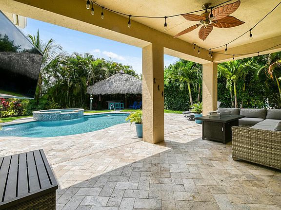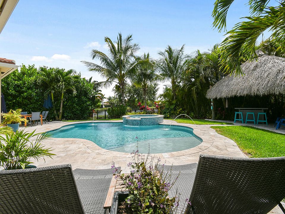 This delightful one story 4/2.5 offers the finest in luxury comfort & style. Impact glass windows & doors, a split floor plan, open modern kitchen with center isle and pendant lights. Tile throughout, plantation shutters are only a few of the highlights. Tropical backyard complete with custom design pool & spa plus a Tiki hut. Perfect home for entertaining of family time.