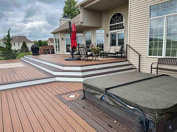 Custom built quality home on Timber Pointe Golf course is an entertainer's dream. 6 bedrooms, 5.5 baths with over 4,300 sq ft of living space. Main floor features master ensuite with 2 walk-in closets, tray ceiling and private entrance onto deck. 2 additional bedrooms with jack and jill bath also on the main floor. 1st floor laundry room. Upper level bedroom with tons of space, walk-in closet and full bath. Loads of natural light overlooking the golf course view. Massive low maintenance tiered deck with built-in hot tub. Finished partial exposure lower level with high 9' ceilings has 2 bedrooms ensuite's, family room with fireplace, large wet bar and 2nd laundry area. Additional features include: zoned HVAC, whole home generator and yard irrigation. Agent related