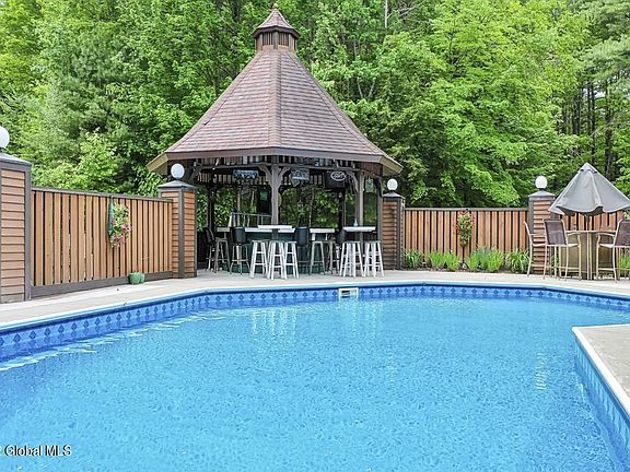 Custom Contemporary home - Less than 1/2 miles from Sacandaga Lake and only 30 minutes from Saratoga. 10' permitted lake access. Spacious home with 4 BRs (2 ensuites), 3.5 BAs & in-law suite w/1 BR, 1 BA, LR, KT with inside & outside entrances. Large LR w/wood burning stove, formal DR, Kitchen w/breakfast bar & large dining area with stunning views of the pool. There is a spacious deck with inground pool, pool house (full bath) & large cabana w/ large bar area; all which are perfect for gatherings. 1st Fl Master Suite w/doors that open to the deck and pool. 3-car garage, with 5-8 additional paved parking spaces. One garage opens to a mechanics dream w/winch, lift, air compressor, & 1/2 BA. The basement also has a rear entrance to park 3 additional vehicles. Over 2 acres of privacy