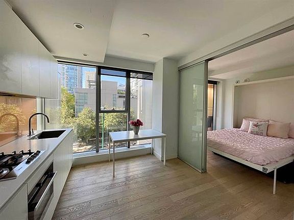 Experience the pinnacle of urban living in this meticulously designed studio at the world-renowned Vancouver House. This suite is a masterpiece of design, boasting high-end interior finishes including Miele appliances, contemporary cabinetry with a stunning copper backsplash, and premium Kohler fixtures.