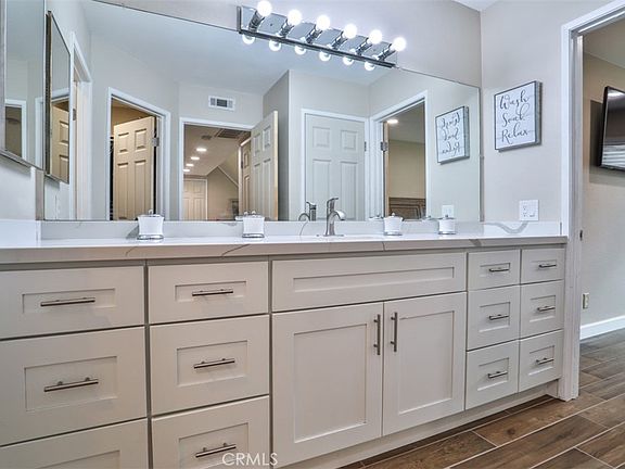 Discover comfort and style in this beautiful fully remodeled and updated 2-bedroom, 1-bath home. Enjoy the wood-look plank tile throughout the downstairs, new carpet upstairs and recessed lighting throughout. The spacious kitchen will not disappoint with its elegant Shaker cabinets, quartz countertops, stainless steel sink, generous storage, and ample counter space complemented by a new Samsung oven and microwave. The gorgeous bathroom features a quartz countertop, walk-in closest and stunning pebble walk-in shower. The new dual-pane windows, new sliding glass balcony door, and new raised panel doors enhance the modern feel. Additional conveniences include a dedicated single-car garage with an automatic opener, in-unit washer and dryer, and access to four community pools and spas. On-call courtesy patrol security adds peace of mind. Located near the 210 and 215 freeways, Cal State San Bernardino, Shandin Hills Golf Course, and Blair Park this home has so much to offer.