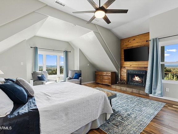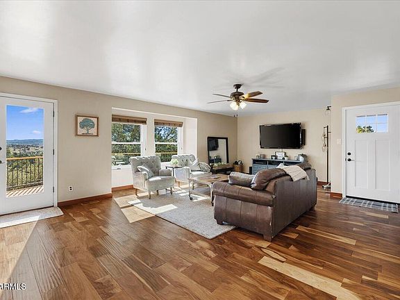 Experience mountain living at its best in this beautifully remodeled two-story home on nearly 2 acres with fenced horse property and panoramic views in every direction. Built in 1998 and recently updated, the home features durable stucco siding, architectural shingle roofing, and wrap-around Trex decks perfect for soaking in the scenery. Inside, the open floor plan boasts rich wood flooring, vaulted ceilings, and abundant natural light. The kitchen shines with birch cabinetry, granite countertops, tile backsplash, stainless steel appliances, and a spacious island ideal for entertaining. Upstairs, the primary suite is a true retreat with its cozy fireplace, private deck, and stunning views. The spa-inspired bath offers dual vanities, a walk-in shower, and modern finishes. Additional highlights include newer windows with lifetime warranty, upgraded AC ductwork, and thoughtfully updated bathrooms. Outside, relax in the hot tub, work from the versatile artist's studio (or garage conversion), or take advantage of the new RV pad with 30-amp hookup. Located just past Inscription Canyon Ranch, this private property offers both serenity and accessibility, with an alternate easement for convenient access.