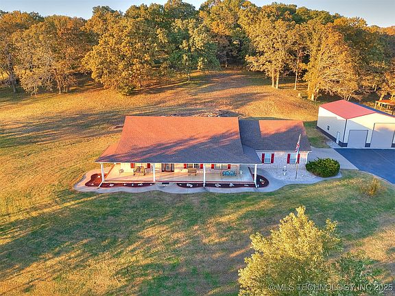 A immaculately maintained peaceful retreat! Beautiful custom one level home on 25 acres M/L. Granite counters, hardwood & tile floors, wide accessible doors, theater/flex room, mud room, plus study or 3rd bedroom. Completely goat fenced & cross-fenced, 2 stocked ponds, huge shop buildiing near the home with overhead doors to fit the largest of RV's alongside your other toys as well. 3 car oversized attached garage with extra tall oversized overhead door for your truck! You will find yet another 40X40 shop with full bath on the property, could be a barn or more storage. Electric gate for security and whole home generator. Fresh back patio with pergola and rock wall. Newer roof with Class 4 shingles plus newer HVAC. Wraparound front porch provides stunning views of the countryside. Inside you will find so many extras, including a large laundry room, vaulted ceilings, cedar closet for storage, whirlpool tub, spacious primary bedroom closet with additional safe room built in. Come view this outstanding country estate close to Will Rogers Downs and minutes to Claremore!