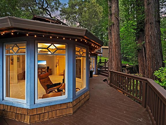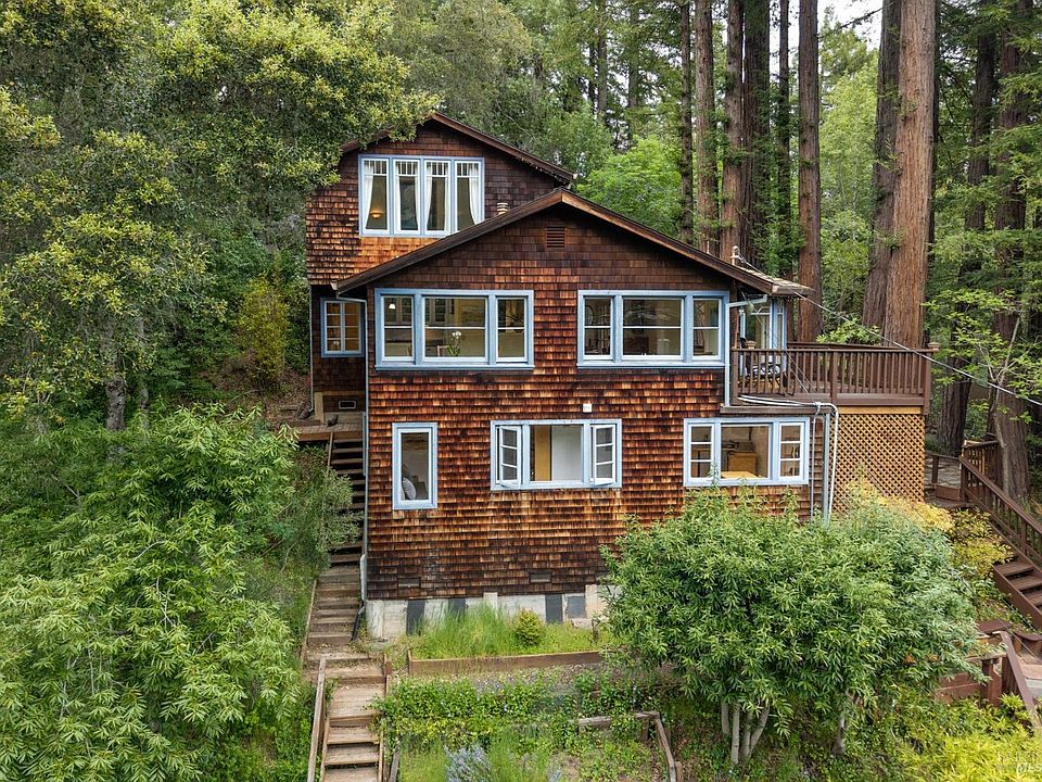 Paradiso del Cielo (Sky Haven) offers a charming vintage home with sun, views and privacy. This heartwarming home is a true sanctuary. Perched high on a hill, the panoramic views of forest ridges and of your own redwood grove will steal your breath away. It's the perfect place to unwind and reconnect with nature. The upper level boasts a magnificent primary bedroom with vaulted ceilings, expansive windows, white oak floors, and a private sun deck for your own personal escape. The kitchen is perfect for culinary creativity. Your guests can retreat to the private lower-level suite, complete with a cozy sleeping cove and an outdoor shower. Enjoy al fresco dining and moments of zen in the detached meditation room of this private oasis. The outdoor spaces are as captivating as the interior. It's much more than a home, it's a lifestyle!