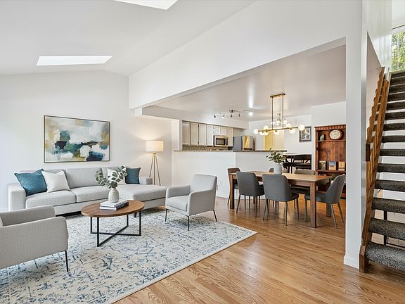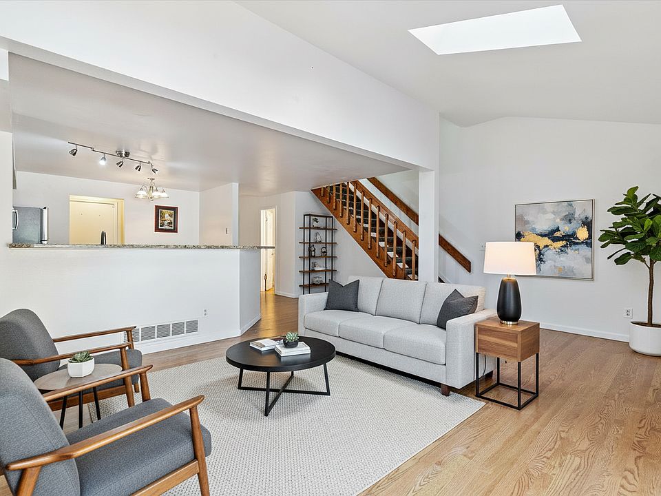 This beautifully upgraded spacious 2-bedroom, 2-bath, 1 car attached garage townhome offers the perfect blend of comfort, convenience, and style in one of the area's most desirable communities. The open-concept main floor boasts soaring vaulted ceilings, two skylights, and a cozy fireplace, creating a bright and inviting atmosphere. The generous family room flows effortlessly to a private, fenced patio that backs to a lush greenbelt ideal for relaxing or entertaining.