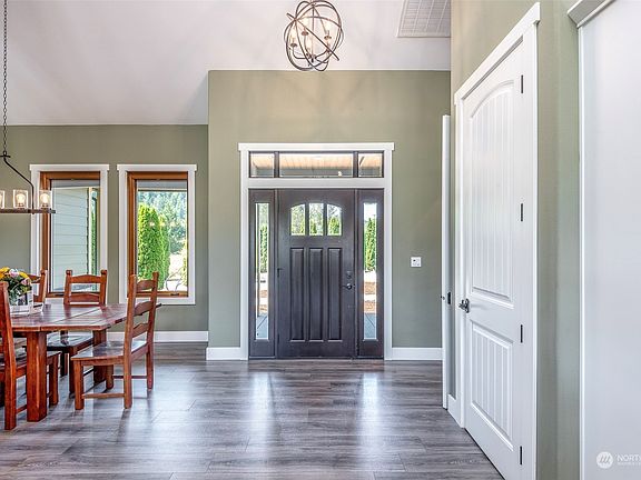 Breathtaking custom farm house sits on 8.6 acres features impeccable finishes such as stunning LVP flooring, motion sensor lights, solar panels, AC, 3-car garage & more! Vaulted ceilings & an abundance of natural light beaming through high windows invite you home. Kitchen showcases Quartz counters, cabinets w/ modern hardware & frosted glass doors, under cabinet lighting, massive center island w/ SS Workstation sink, wine cooler & gas range! Spend evenings lounging on the covered back porch admiring views of Mt Rainier, beautiful sunsets & fruit trees. Spacious primary bed w/ luxurious ensuite bath reveals quartz counters w/ dual sinks, under vanity lighting, oversized tile shower & enormous walk-in closet w/ custom built-ins & chandelier.