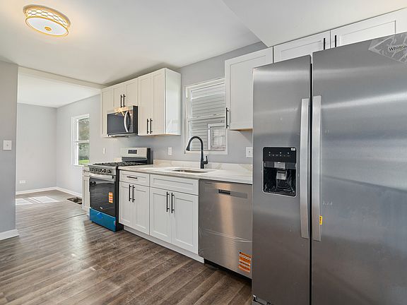 Completely remodeled and absolutely stunning, this move-in ready 4 bedroom, 2 bath home offers the perfect blend of modern elegance and functional design, featuring a large sun-filled living room accented by crisp raised-panel white doors and trim throughout, a main level with wonderful potential for related living thanks to a spacious bedroom and beautifully updated full bath with detailed tile accents and oversized tub, a gorgeous fully updated kitchen boasting white cabinetry, sleek white quartz countertops, and stainless steel appliances, and a spacious family room highlighted by a custom entertainment wall; the finished basement extends the living space with a huge fourth bedroom and plenty of storage, while the second level hosts two additional bedrooms including a generous primary suite with double closets as well as a second full bath with an oversized tub and quartz-topped vanity, and outside the fenced yard leads to a two-car garage-all enhanced by peace of mind with new windows, roof, HVAC, plumbing, and updated electric.