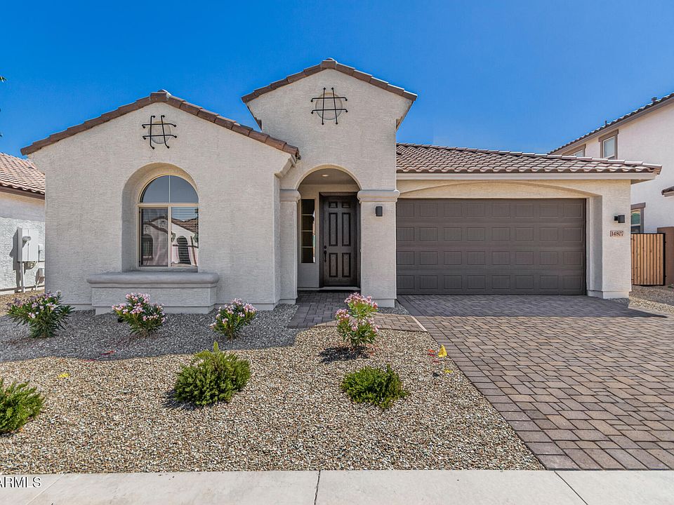 Don't miss this brand new build that is ready for you to move in and not have to do a thing. It comes with a fully landscaped backyard, window fixtures, appliances and is still under builder warranty until March 2026. This spacious single-story home features four bedrooms, open living area, and a wonderful outdoor retreat. You'll appreciate the open-concept kitchen and living room, with an oversized kitchen island perfect for entertaining. The private primary suite is located at the back of the home and includes a walk-in closet and a spa-inspired super shower. The secondary bedrooms are thoughtfully positioned at the front for added privacy. You'll also love the large covered patio, ideal for relaxing in the backyard. This home is located in scenic Surprise, within the Los Cielos community, offering convenient access to shopping, dining, and entertainment, all just a short drive away.