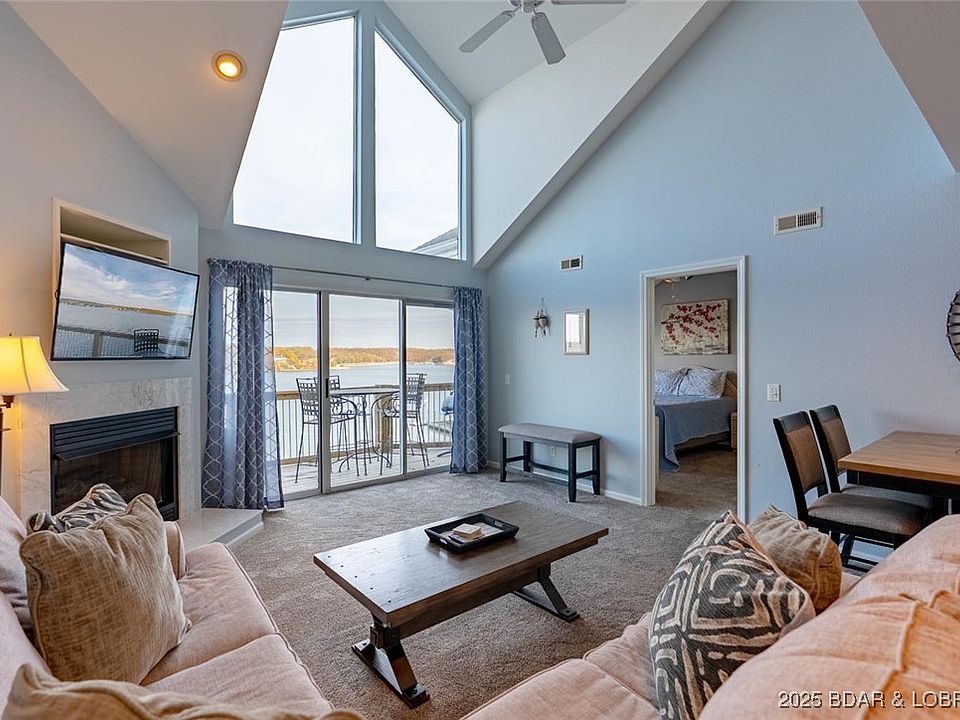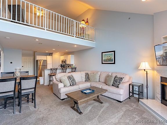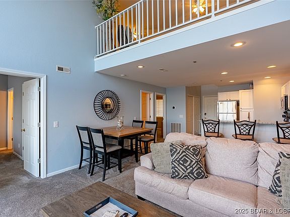 Stunning Top-Floor Lakefront Condo with incredible views! Experience lakeside living at its best in this beautifully updated top-floor condo in the heart of Osage Beach. This turn-key unit offers panoramic main channel views, but a cove protected 10x30 covered boat slip, and an excellent rental history. The spacious two-story living area features floor-to-ceiling windows that fill the home with natural light and showcase breathtaking lake views. The primary suite includes vaulted ceilings, private deck access, and an ensuite bath with double vanities. Upstairs, a loft provides a comfortable second living area or guest space, also with lake views. Recent updates include new appliances and newer furnishings, making this property move-in or rental ready. Located within the sought-after Ledges complex, residents and guests enjoy access to two community pools, a sandy beach, and a playground. Short-term rentals are permitted, offering a strong investment opportunity in a prime location close to dining, shopping, and entertainment.