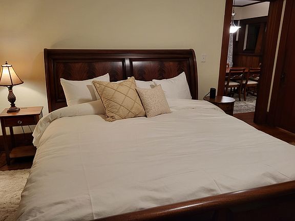 Return to yesteryear with Traditional Craftsman Woodwork including built in buffet, bookcases with pillars, classic wainscoting, and built-in bench seating flanking the fireplace. Beautifully restored original Douglas Fir hardwood flooring in Living and Dining Rooms is enhanced by quality room-size rugs. Enjoy the beauty of 2 large bedrooms with original redwood plank flooring, one King sized bed, and one Queen sized bed. Antique dressers complete the look. All linens provided.