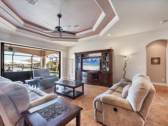 WATERFRONT POOL HOME WITH DOCK & 16K COVERED BOAT LIFT! This thoughtfully designed 3-bedroom, 3-bath, 3-car garage canal-front home offers a solid layout, beautiful views, and plenty of potential to make it your own. INTERIOR FEATURES & LAYOUT Enjoy water views the moment you walk in. The light-filled open floor plan flows easily through the great room, featuring detailed tray ceilings, ambient rope lighting, and multiple sliding glass doors that open to the lanai and pool. The window in the dining area and the sliders have tint for added comfort and energy efficiency. A spacious den or flex room near the entry is perfect for a home office, hobby space, or library. The guest bedrooms can be closed off from the main living areas, offering privacy for family or friends. GOURMET KITCHEN & ENTERTAINING The upgraded kitchen is designed for both everyday living and entertaining. It features custom cabinetry, stainless steel appliances, granite countertops, and a large bi-level island with bar seating. Several lower cabinets include wooden pull-out shelves for easy storage and organization. An aquarium-style window in the dining area frames a beautiful water view. The kitchen opens to the great room and dining area, making it ideal for gatherings. PRIMARY SUITE & BATHS The private owner’s suite offers direct lanai access, a walk-in closet, and a spa-inspired bathroom with a jetted tub and an oversized walk-through shower with dual shower heads and controls. Two additional bedrooms and baths provide flexible space for family, guests, or a second office. The third bath also serves as a convenient pool bath, accessible from both the hallway and the pool deck. OUTDOOR LIVING & WATERFRONT ACCESS Step outside to your own slice of paradise. The oversized screened lanai features a heated saltwater pool with beach entry, five fountains, and a sun shelf—perfect for lounging and entertaining. The exterior was recently painted and includes concrete curbing, upgraded landscaping, and a circular paver driveway with plenty of parking. For boating enthusiasts, there’s a composite dock with a 16,000 lb covered boat lift and a straight canal view that provides quick Gulf access. A walkway runs from the front of the home to the back along the side, leading to an outdoor shower and a storage closet for pool equipment and accessories. ADDITIONAL UPGRADES & HIGHLIGHTS • Impact-rated windows (except dining window) and doors • Tinted sliders and dining window • Tray ceilings with accent lighting • Tile throughout main areas • Saltwater pool with fountains and sun shelf • Outdoor storage closet for pool equipment • Outdoor shower and side walkway • Circular paver driveway and concrete curbing • Guest bedrooms can be closed off from main living areas • Coat closet, ceiling fans, and attention to detail throughout Enjoy the best of Southwest Florida—boating and fishing right from your backyard or simply unwind with your favorite drink while taking in the peaceful canal view. This home is the perfect combination of waterfront comfort, outdoor living, and move-in ready style.