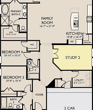 Four bedroomsThree bathsRetreat style primary bedroomSpacious great roomPrivate studyOpen-concept kitchenAiry covered patio