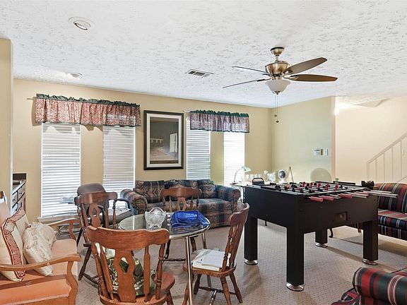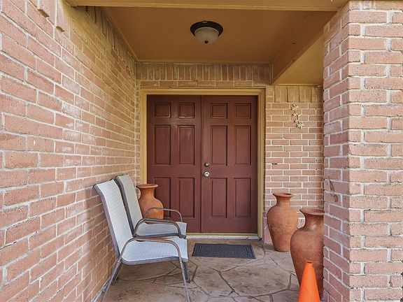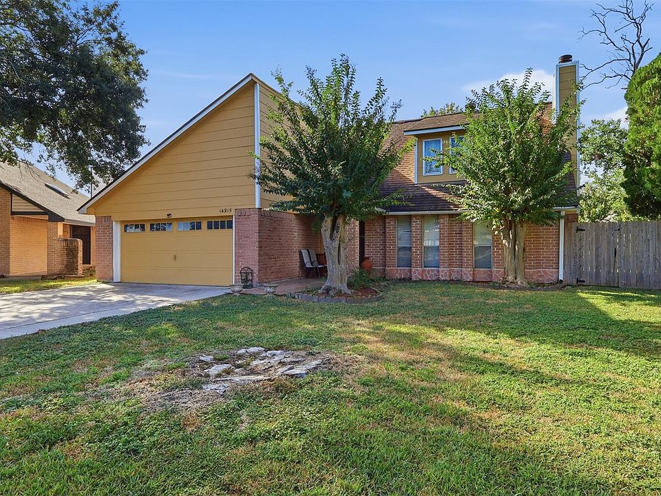 This two-story home in the Windfern Forest subdivision sits on a roughly 9,600-sq-ft lot and features yellow siding with a brick façade, a 2-car garage, and a covered porch. Inside, the main level offers an open layout with a carpeted staircase leading upstairs. The front living/game room includes built-in shelving, a stone fireplace, a ceiling fan, and carpeted flooring. A separate home office features built-in cabinets and a mini-split AC unit. The U-shaped kitchen includes dark wood cabinets, a gas range, dishwasher, and breakfast bar, with newer plank flooring that flows into the dining area. A half bath and laundry room are located on the main floor. Upstairs are three bedrooms and two full baths. The large fenced backyard offers mature trees and plenty of lawn space for outdoor activities.