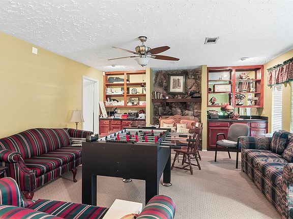 Stone fireplaceCarpeted flooringCarpeted staircaseSeparate home officeNewer plank flooringBuilt-in shelvingDining area
