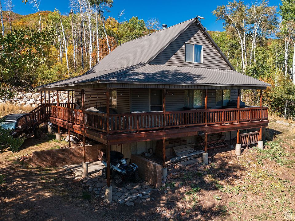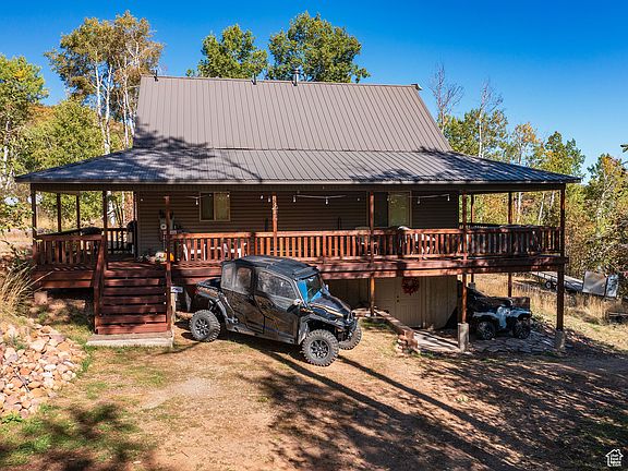 Nestled above Causey Reservoir in the coveted gated community of Causey Estates, this beautifully maintained 3-bedroom, 2-bath cabin offers the perfect mountain retreat. Surrounded by a mature grove of quaking aspens with stunning mountain views, the property includes power, septic, and a spring-fed water system maintained by the HOA for year-round comfort. The freshly stained, covered, wrap-around deck offers shade screens and creates a welcoming outdoor living space. Enjoy a morning soak in the hot tub, take a brisk mountain walk, or spend evenings roasting marshmallows and watching abundant wildlife from your private deck. The large corner lot features a U-shaped in-and-out dirt driveway with plenty of parking for friends and family, RV parking with a waste hookup, and a large shed for additional storage. Inside, the cabin boasts updated appliances including a Bosch dishwasher, LG refrigerator, range, and microwave. A Fisher large box wood-burning stove keeps the whole living area cozy, complemented by a smart thermostat for the furnace, and a window swamp cooler for summer comfort. The walk-out basement includes a mud and laundry room with propane wall-mounted heaters that keep you toasty as you shed your winter gear. The unfinished area offers flexible space with room to park four-wheelers or a side-by-side, plus plenty of additional space for a game room or storage. Whether for weekend getaways or extended stays, this cabin blends rustic charm with modern comfort, a rare find in Causey Estates. Square footage figures are provided as a courtesy estimate only and were obtained from county records . Buyer is advised to obtain an independent measurement.