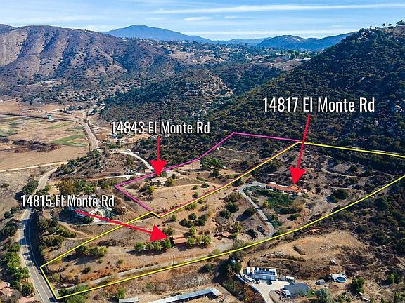 Prideful 11.05 ac estate with stunning views located near El Monte Park. Horse lovers, contractors etc.. You have found paradise!! Your investment inc. (2) legal adjacent parcels comprising of (3) permitted residences and a 40'X30' permitted enclosed workshop (approx. size) In all, a total of 6BR/4.5 BA and 4213 sqft (sqft does not include workshop). Details of parcel #393-033-16- addresses 14817 & 14815 totaling 6.46 ac. The primary home is a custom 1 story 3/2 w/large 2-car garage. Beautiful views from all rooms, featuring: In-ground elaborate lap pool w/ water features, water softner & purifying system, recessed lighting, ceiling fans, executive style master suite, spacious laundry room. Truly an open floor plan w/wrap around fireplace. (approx 2400sqft). Detached separate 1Bd/1Ba unit w/ living room, kitchen & shower (approzx 500sqft) This parcel also provides an additional non-permitted studio w/shower. Details of parcel #393-011-06 address 14843 totaling 4.59 ac. Custom 2BD/1BA home featuring a living room,kitchen & basement totaling 1290 sqft VIEWS! Awesome 40'X30" approx enclosed workshop permitted w/power. This parcel inc. "The Campground", a massive level pad w/power & water. Ideal for parties and RV stay overs! VIEWS! Additional estate details- Horse trails, corral with shelter/2 stables and turn-out. 2 additional corrals, arena & ring. Productive 6-8 GPM(approx) well w/ 3 storage tanks. Efficient rainwater capture system that holds over 1000 gallons, Storage tank on top of hill. Tons of on-site parking. Hiking trails nearby from Lake Jennings to El Monte Park. Estate has (2) legal access locations off El Monte Rd for ingress & egress. Also, Hiking & riding trails from Lake Jennings to El Monte Park. Agents, This Ponderosa estate is a tremendous opportunity for your East County buyers!!