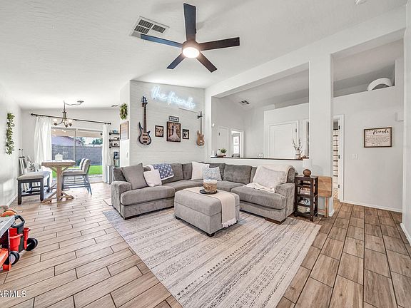 Welcome home! Beautifully updated single story home showcasing an open and airy floor plan with vaulted ceilings, wood-look tile flooring throughout and freshly painted interior in 2024. The spacious living area offers plenty of natural light and a welcoming atmosphere, ideal for relaxing or entertaining. The kitchen opens seamlessly to the great room for easy everyday living. Step outside to a newly transformed private backyard with a covered patio, NEW artificial turf (2025), low-maintenance landscaping with a fire pit for your enjoyment—perfect for gatherings or quiet evenings at home. Pride of ownership shines throughout this move-in ready home, conveniently located near parks, schools, and shopping.