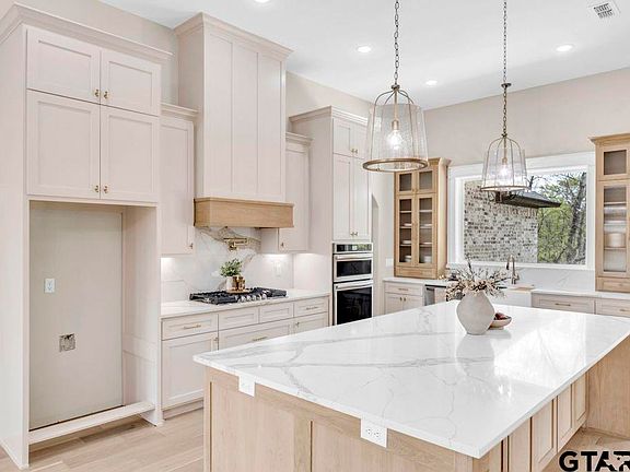 New construction home featuring a tankless water heater, a large white oak kitchen island, and a gas stove. The kitchen includes a stove, dishwasher, oven, microwave, and a large sink. The primary suite offers dual vanities, a soaker tub, and a custom shower. Ample natural lighting throughout the home. Custom built-in cabinets provide additional storage. The walk-in pantry and spacious laundry room include a utility closet for vacuum and broom storage. Engineered hardwood and checkered flooring throughout. The home sits on a 0.72-acre lot with a spacious yard. The garage offers extra storage space.