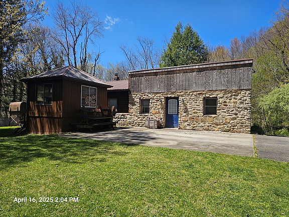 Looking for a vacation home, Airbnb potential, or to make this your permanent home? This unique custom-built house (with a cabin feel) sits on a full basement. The cabinets are custom built Wormy Chestnut. A portion of the house was once a single wide trailer. The metal frame exits but sits on a basement and the exterior is encased in rock with a block foundation. It has been redone through and through and built onto. The majority of the house has tile floor, and 2 bedrooms have Vinyl plank flooring. One small bedroom was being used as a closet recently and fixtures can be removed. House is heated by a stove, baseboard electric, and oil monitor. There is a great room which could also be partitioned to make another bedroom if need be. The house is in a semi-private location and situated on .3 +/- acres. There is an enclosed gazebo however the hot tub does not work.