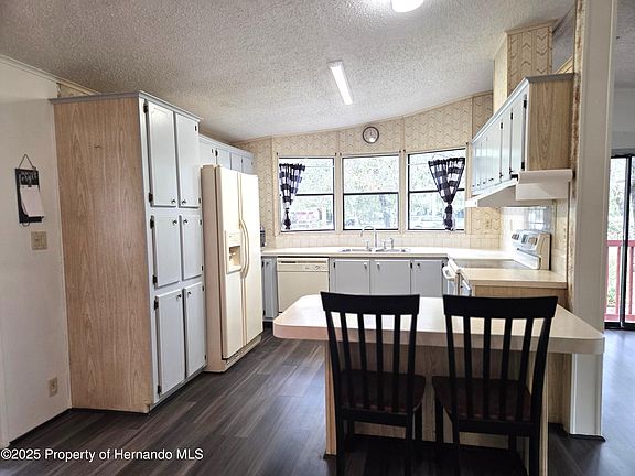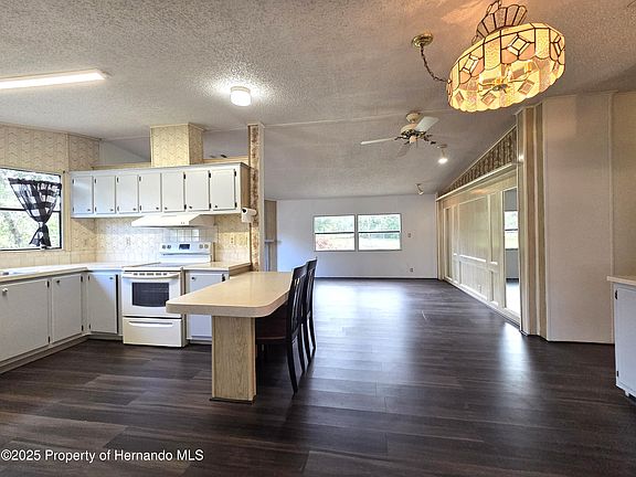 Spacious 2 bedroom, 2 bath manufactured home on 1.55 acres zoned AR. This property features an open floor plan with new luxury vinyl flooring, a huge covered porch, an indoor laundry room, and a roof replaced just 4 years ago on both the home and the garage. The primary bedroom offers its own en-suite bathroom, and both bedrooms include walk-in closets for plenty of storage. The kitchen has a breakfast bar and opens to the dining room, which features built-in storage and sliding glass doors that lead to the porch, while the living room boasts a cozy fireplace and sliding glass doors that open to the side entrance. The oversized 2-car garage includes loft storage, additional storage space, and a first-level apartment with its own covered entry, perfect for guests, rental income, or an in-law suite. The yard is fully fenced with a gated entry and also includes a shed for even more storage. Bring your boats, RVs, and toys—there is more than enough space to make this property your own. This one-of-a-kind property offers flexibility and a great opportunity to enjoy Florida living. Property is located approximately 3 miles to the Suncoast Highway, 8 miles to boat ramp, 3 miles to shopping, restaurants, and hospital.