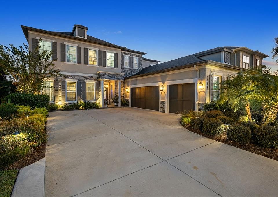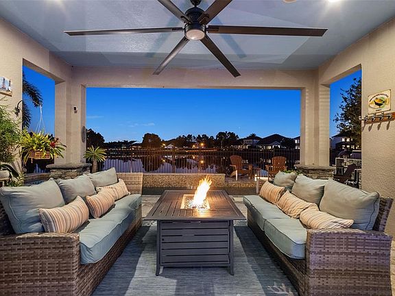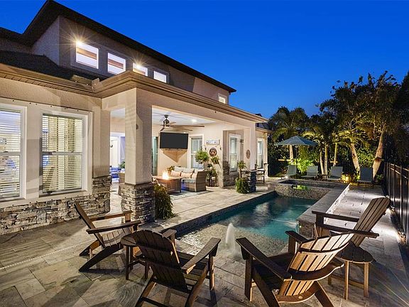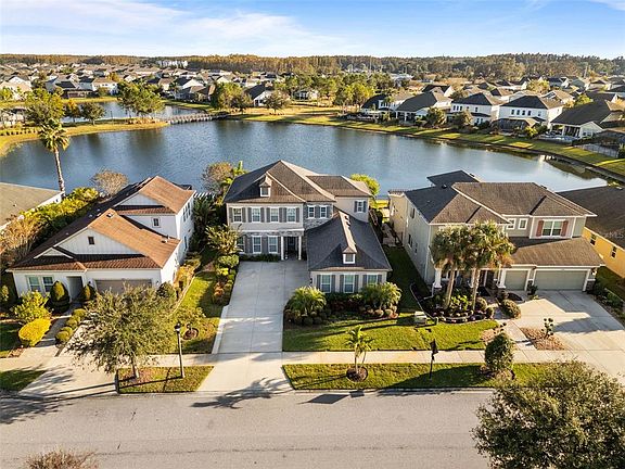 One of the most impressive homes to come to market in Asturia, this 6-bedroom, 5-bath Ashton Woods Caladesi II sits on a premium pond-view lot and immediately stands out for its elevated design, rare features, and entertainer-focused layout. The stone-accented façade, thoughtfully designed exterior lighting, and oversized driveway give the home a commanding presence from the moment you arrive. Inside, the home reveals a level of refinement you won’t find elsewhere in the neighborhood. Thoughtfully enhanced far beyond the standard builder package, it’s loaded with custom, high-end upgrades that elevate both style and function—starting with the open-tread staircase and continuing throughout the first floor. Just off the entry, the finished bar room with exposed beams and a full bar setup creates an unforgettable first impression. If a bar isn’t your preference, the space easily transitions into a formal dining room, flex room, or additional living area. Rounded drywall corners throughout add a subtle, premium finish. The open-concept great room showcases soaring ceilings, exposed beams, built-in speakers, and a wall of windows framing serene pond and pool views. The chef’s kitchen features white cabinetry with glass-front uppers and internal lighting, a gray contrast island, upgraded granite counters that extend into a full backsplash, stainless steel appliances, a natural-gas cooktop with pot filler, wall oven, and custom pendant lighting. A spacious dining area sits just off the kitchen with its own view of the outdoor retreat. Step outside to a private resort-style oasis complete with a heated saltwater pool and hot tub, tropical landscaping, extensive deck space, covered lounge area, and a full outdoor kitchen with Blaze refrigerator, ice maker, and grill. The entire pool and spa system is app-controlled, allowing you to heat the pool or hot tub remotely. Professional lighting transforms the backyard into a stunning nighttime setting, and the covered patio includes built-in speakers. The first-floor primary suite offers a built-in fireplace, plantation shutters, and relaxing pond views. Its en suite bath features dual sinks and a walk-in shower with dual showerheads, while the fully customized walk-in closet includes built-in lighting, white cabinetry, and a boutique-style organization system. A second first-floor bedroom sits nearby with a full bath just outside. Upstairs, a spacious loft separates two private wings. One wing features a guest suite with its own en suite bath. The other includes three additional bedrooms—two connected by a Jack-and-Jill bath, plus another full bath just outside the third bedroom. Additional features include 8-foot doors on both levels, an app-enabled security system that conveys, and the home’s prime location just three houses from the neighborhood park and playground. Residents of Asturia enjoy a resort-style pool, modern clubhouse, fitness center, playgrounds, dog park, and scenic walking trails. The home offers quick access to the Suncoast Parkway at approximately 2.4 miles, along with multiple dining and shopping options within 2.5 miles. Zoned for Odessa Elementary, Seven Springs Middle, and JW Mitchell High School. Video tour and floorplan are included.