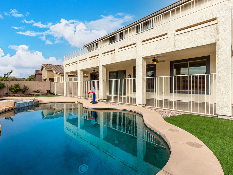650 minimum credit. Rare to find a rental in this neighborhood in Goodyear! Loads of sq ft and a fenced private pool with pool service included! All appliances are included as well. This move in ready home with a spacious open floorplan, high ceilings, tile flooring and elegant plantation shutters throughout. Tons of living space perfect for entertaining and the kitchen is equipped with SS appliances, granite counters and island with raised breakfast bar. One bed and bath located downstairs, plus laundry room. Upstairs reveals a loft space for any configuration and plenty of ample sized bedrooms. Large master retreat offers private balcony. Master bath has double sinks, glass shower and separate tub. Lovely backyard includes extended covered patio and fenced pool area with spa, perfect for entertaining. $2700 security deposit, $500 cleaning deposit, $20 monthly admin fee. Tenant must maintain tenant insurance during their tenancy.